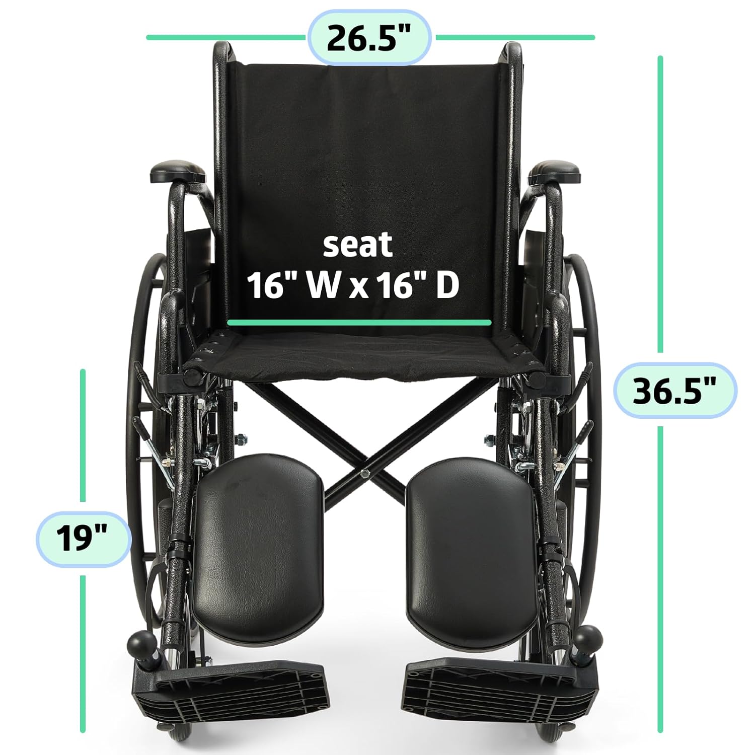 - COMFORTABLE AND CUSTOMIZABLE: This wheelchair has a 16"W x 16"D seat; swing-back, desk-length arms allow for easier lateral transfer and access to tables and desks; elevating leg rests for greater comfort